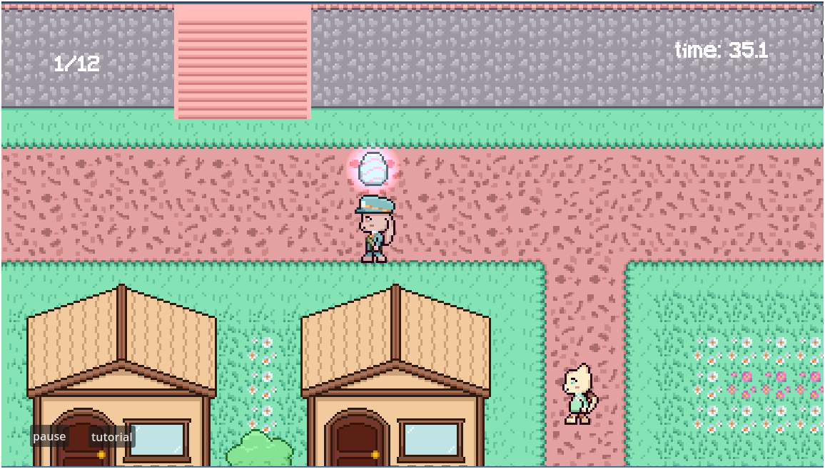 You play as a bunny courier delivering eggs to all the residents in her town! The closer the egg is to a destination, the brighter it glows! The game contains a normal mode, an endless mode, custom player name, and a seamlessly looping map! There are also unique illustrations for when you win normal mode, lose normal mode, or complete endless mode! Enjoy playing!